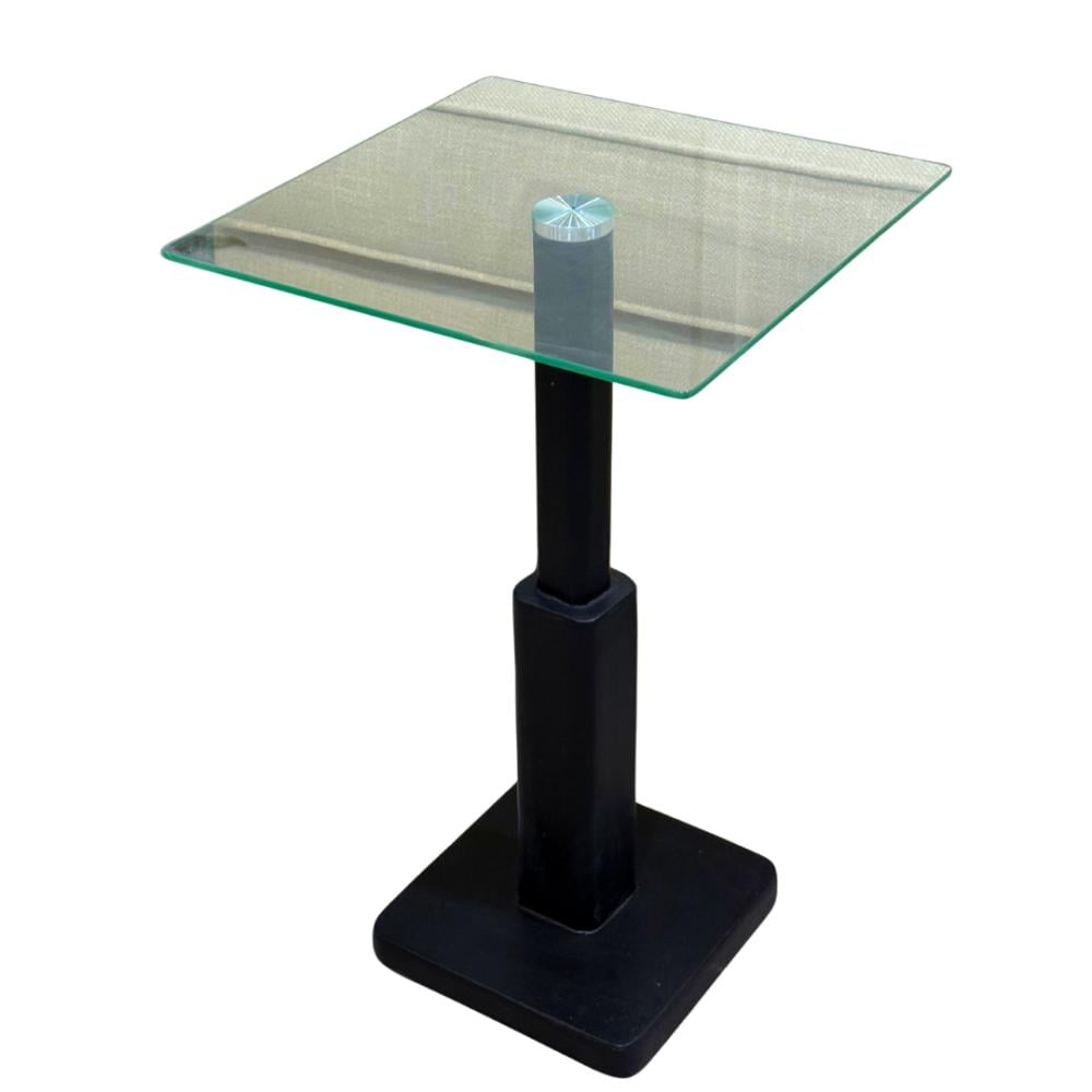 طاولة جانبية مربعة بسطح زجاجي شفاف وقطعة بديل الرخام وقاعدة رخامية – عمود حديد ذهبي (35×35×50 سم)