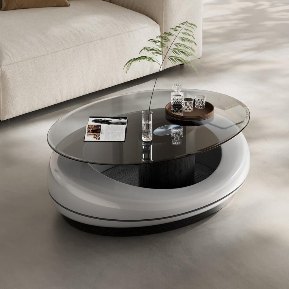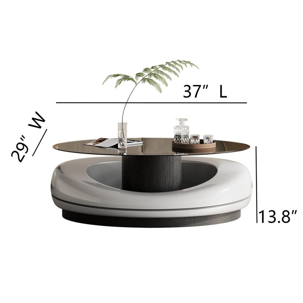 أضف لمسة من الفخامة والابتكار إلى منزلك مع طقم طاولات التقديم العصري المكون من قطعتين. تصميم انسيابي مستوحى من الأسلوب العصري الحديث، يجمع بين قاعدة بيج لامعة وسطح زجاجي أسود أنيق.